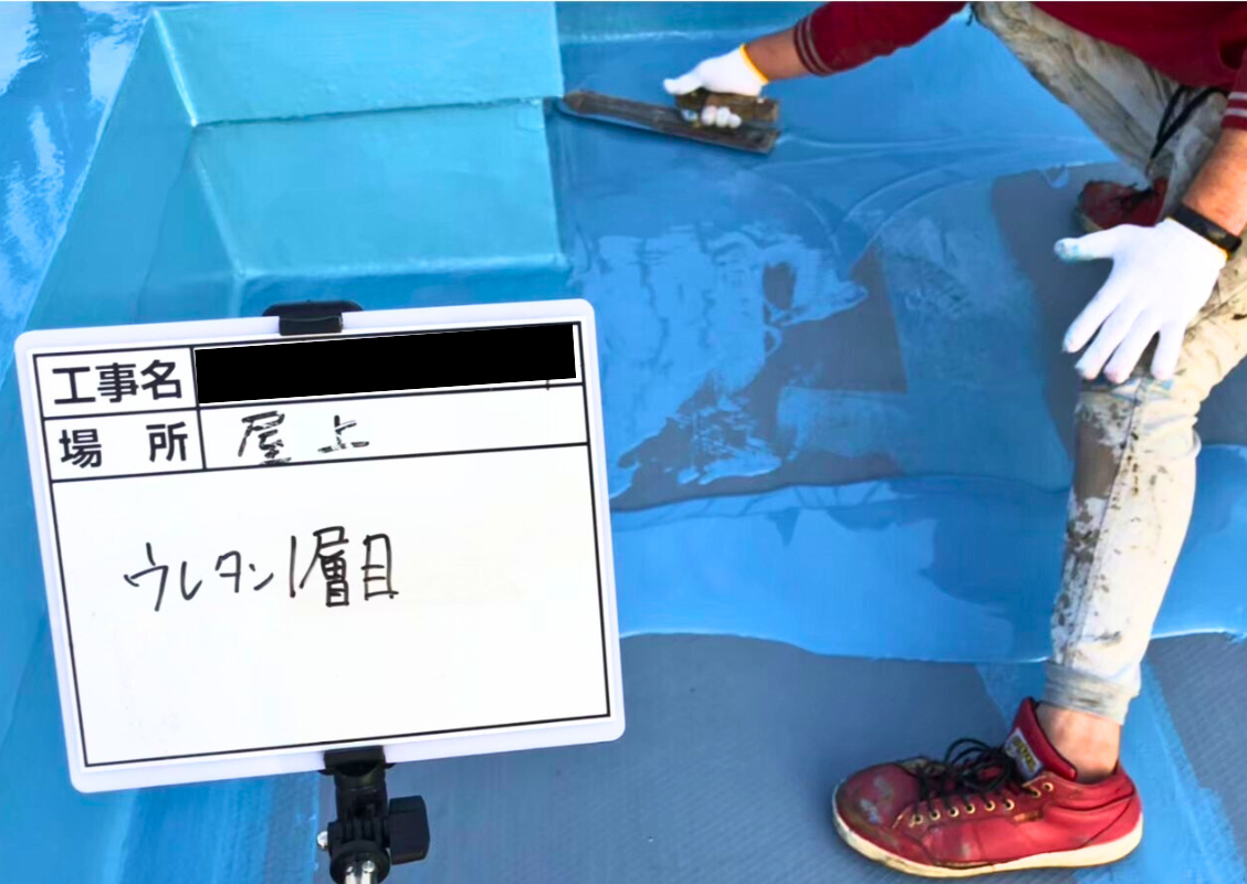 ウレタン一層目は、重要な工程なりますので、硬めの材料で肉厚感を出すことによって、防水性能を高めていきます。