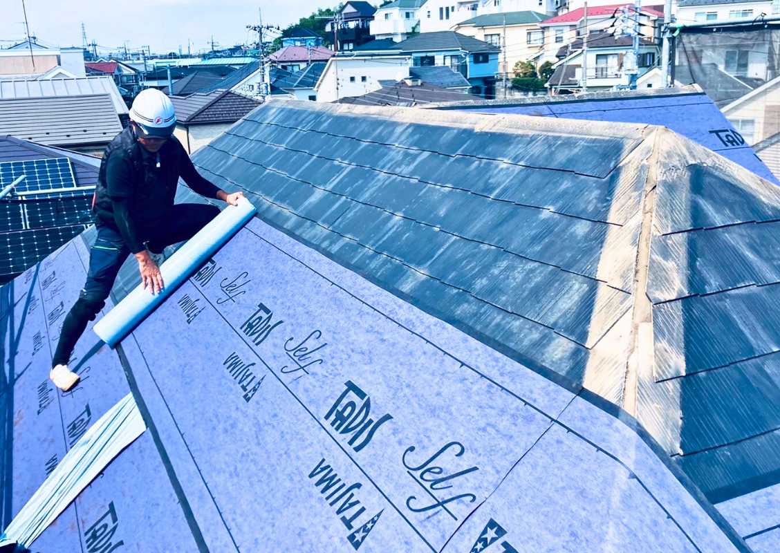 その後、防水シートの張り付けです。しっかりと張り付けないと雨漏れの原因にもなります。